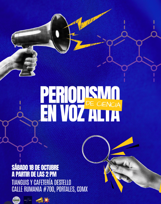 ![]() | Periodismo en voz alta y la Red Mexicana de Periodistas de Ciencia se unen para leer historias de ciencia en la Ciudad de México. Este evento también se suma a la celebración por el aniversario de la Colonia Portales. 🥳 ¡Te esperamos! 📅 Sábado 18 de octubre a las 14 horas. 📍Inicia en el tianguis de avenida Emiliano Zapata, Portales Sur, CDMX y a las 14:30 horas se mueven Destello Café. 🔴 ENTRADA GRATUITA 🔴 |