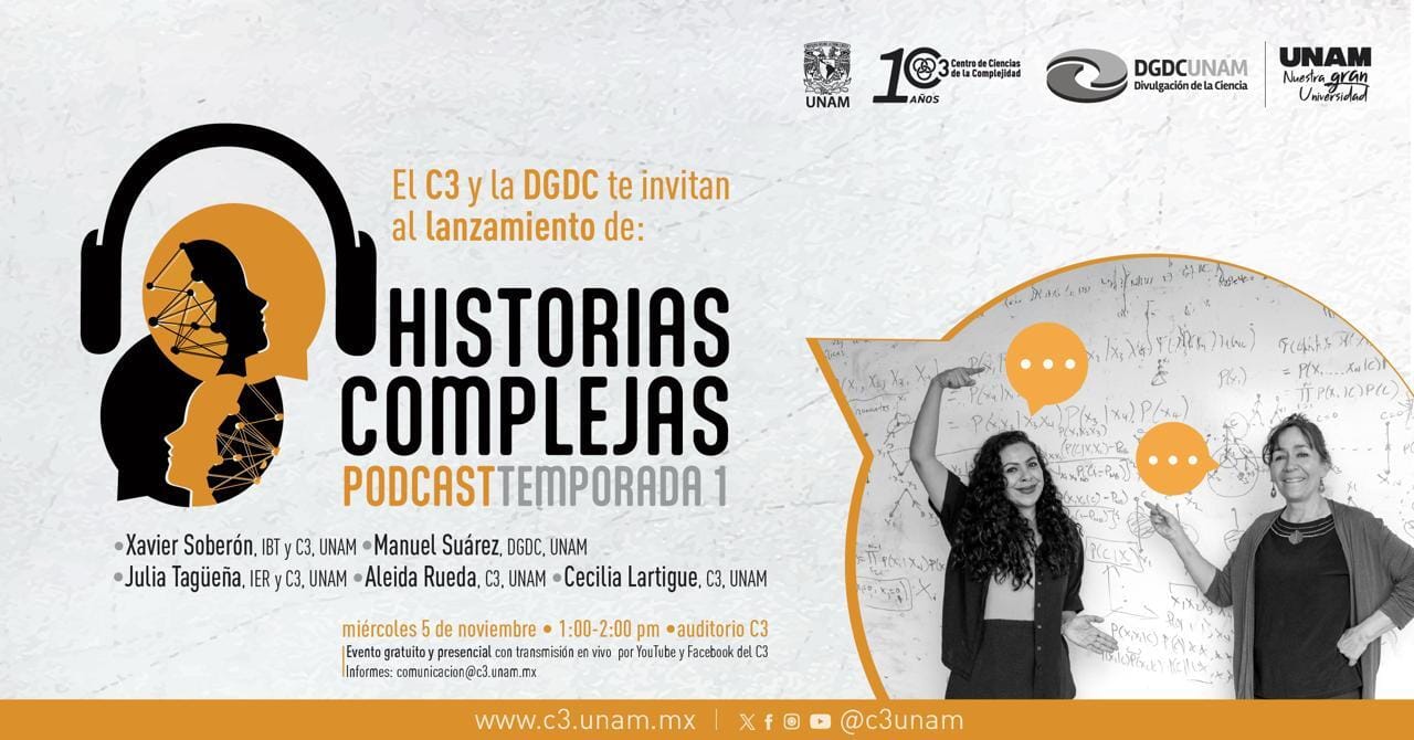 Y si lo tuyo son las historias sonoras, el Centro de Ciencias de la Complejidad en alianza con la Dirección General de Divulgación de la Ciencia de la UNAM lanzará el podcast "Historias Complejas" conducido por Aleida Rueda (cofundadora de la RedMPC) y Cecilia Lartigue.