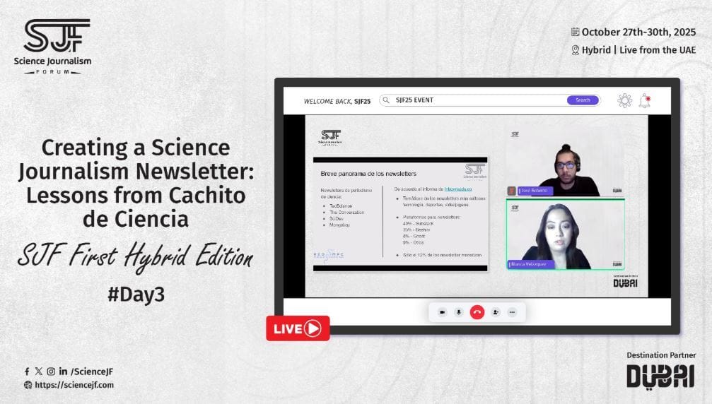 Roberto González y Blanca Andrea Velázquez del equipo de Cachito de Ciencia participaron en Science Journalism Forum 2025. En la charla explicaron la historia del newsletter y cómo lograr una dinámica de trabajo exitosa para los boletines de periodismo científico.